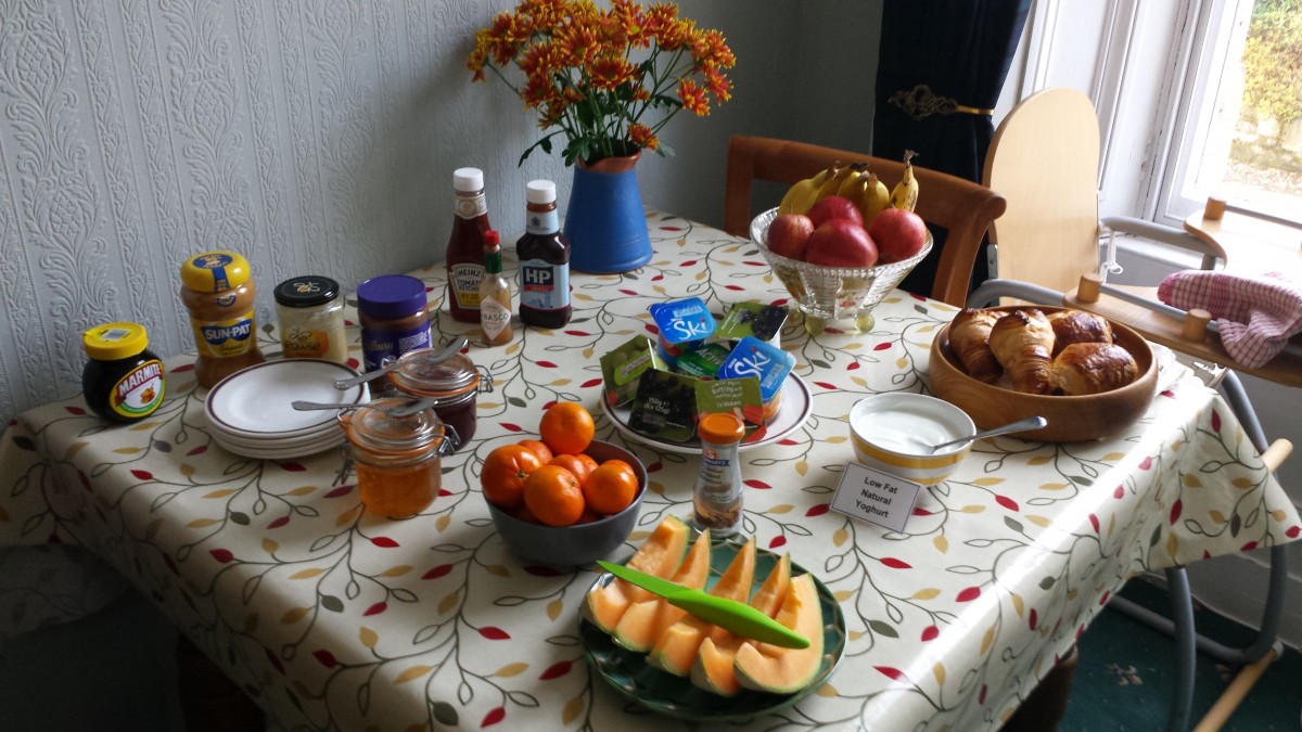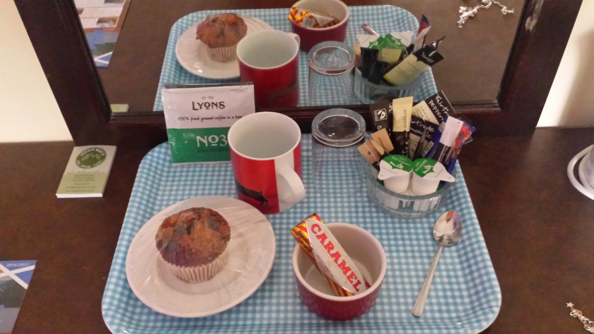 My room was up in the attic and was a beautiful wee snug of lavender and pale green, with an en suite shower room and loo. Another muffin – chocolate and banana, OMG! – and a tunnocks wafer biscuit awaited me on my tea and coffee tray. The bed was super comfy but the ultimate home-from-home luxury for cauld-tattie-me was a wee hot water bottle. Heaven!
