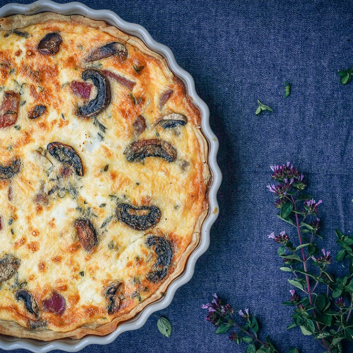 5. Spread the chopped beetroot, mushrooms and crumbled feta evenly across the base of the tart. In a bowl, whisk the eggs, milk and cream together and pass through a sieve to remove any eggy threads. Add in salt and pepper to season and the chopped thyme and parmesan and pour over the base.