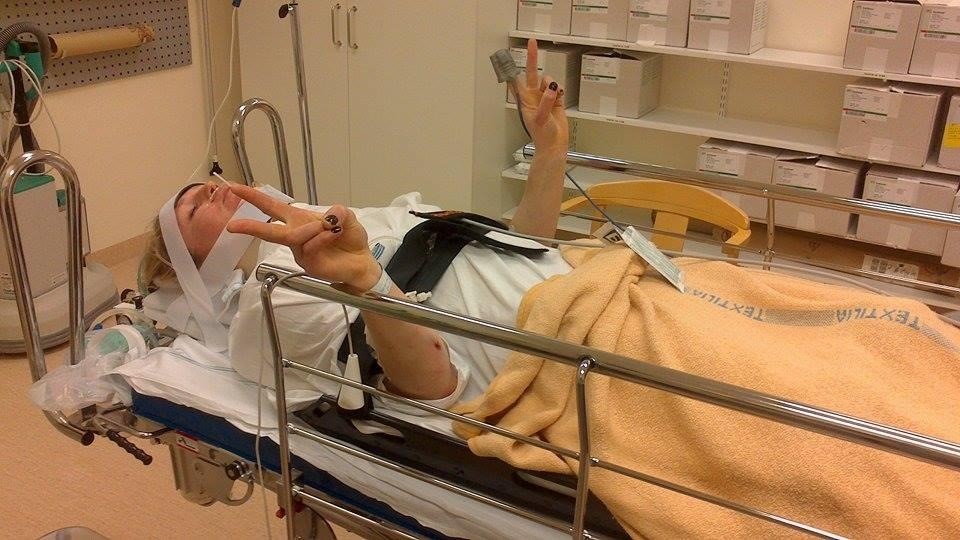 “I didn’t think it was that bad at first. As I came off the track I could see the tree stumps and a rock – which I hit – and I landed with my face flat in snowy moss. I knew it was a sore one but I thought I was just bruised. I was screaming and I was winded pretty badly but when that wore off the first thing I asked was ‘Are my skis okay?’. My coach called the paramedics, they rolled me onto a stretcher and trundled me down the hill.