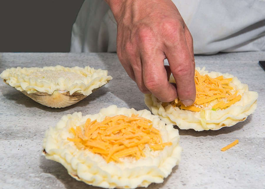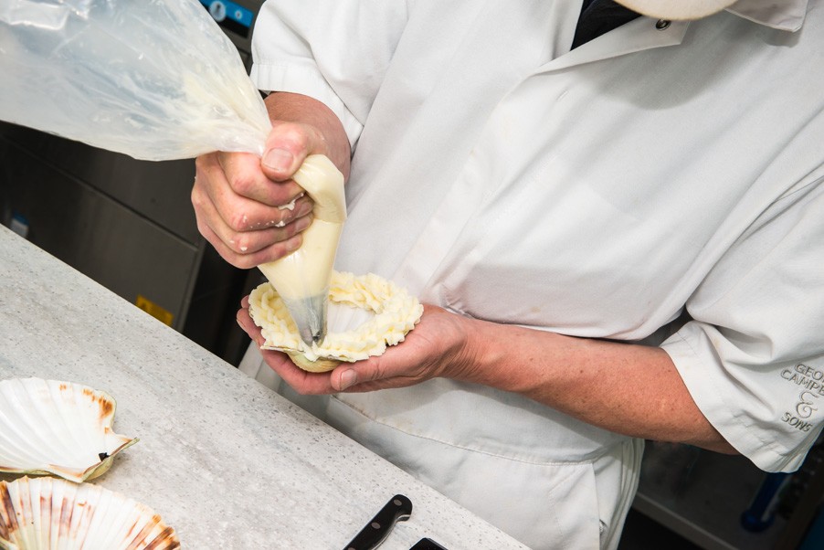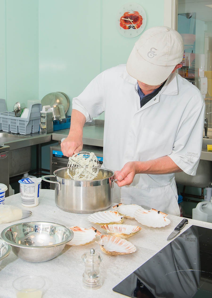 I have photographed the chef this week working at different stages of creating this dish to help you make this at home. It was the first time I have tried Coquille st Jacques and I'm hooked. If you are limited on time then the good news is that Campbell's sell this dish pre packed in their shop or by pre order by calling the shop or going to their website and placing an order online.