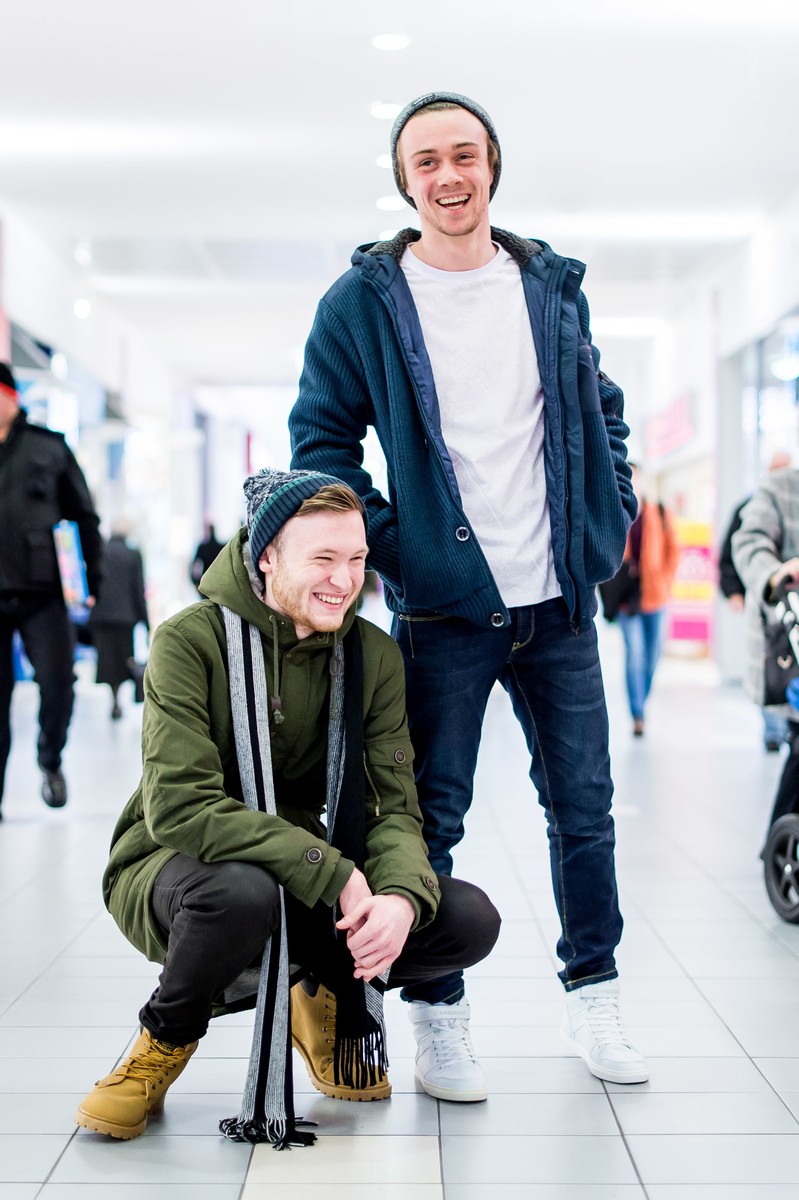 Mikey: Khaki coat, Black Jeans, Grey and Black Scraf, Work Boots, Fair Isle Hat