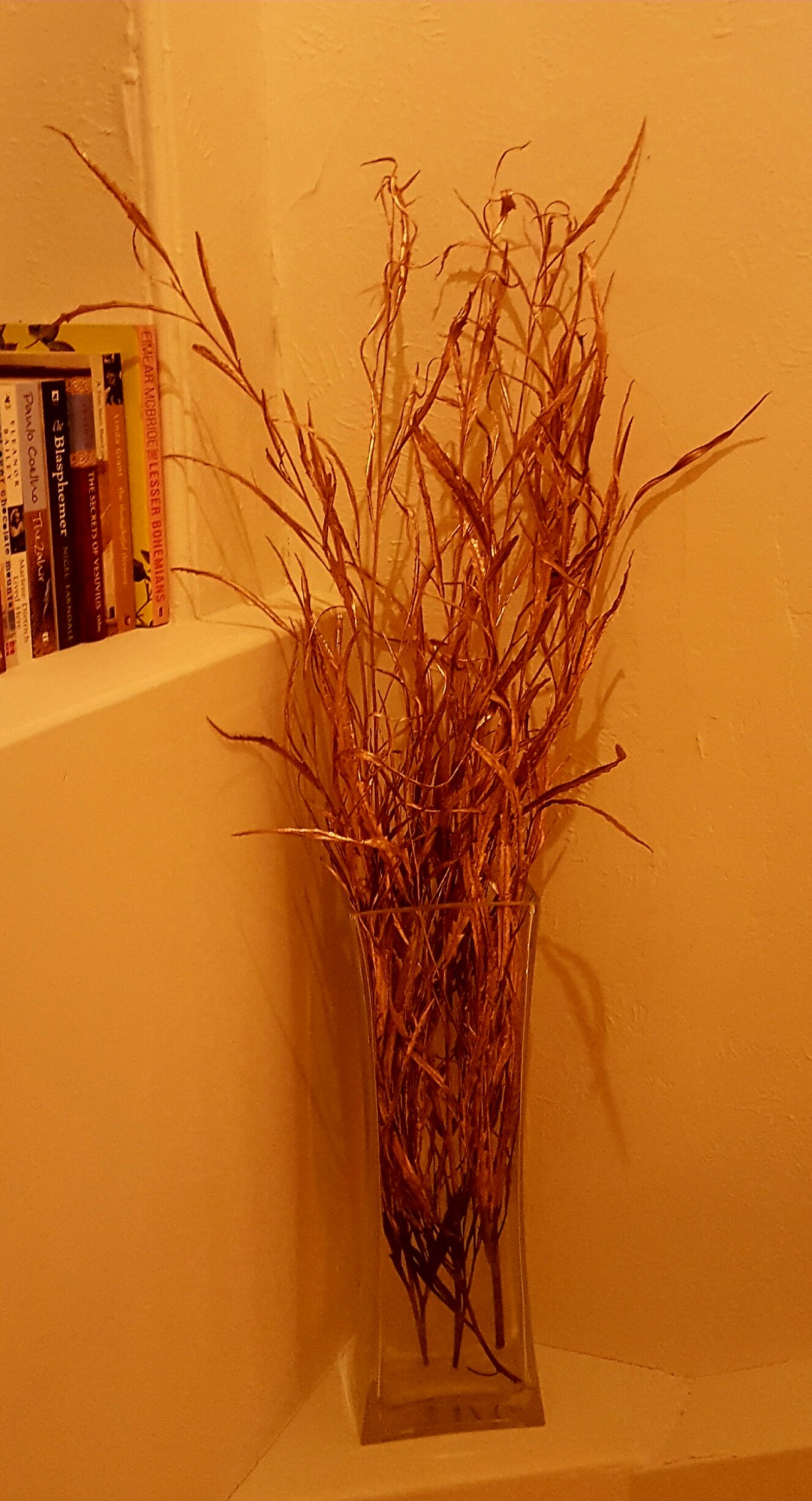 Audrey was busy making Christmas centrepieces and wreaths when I arrived and after a wee browse round I added a few stems of gold leaves to my tab. Total cost of coffee stop, cake and new gold stems, £11.45.