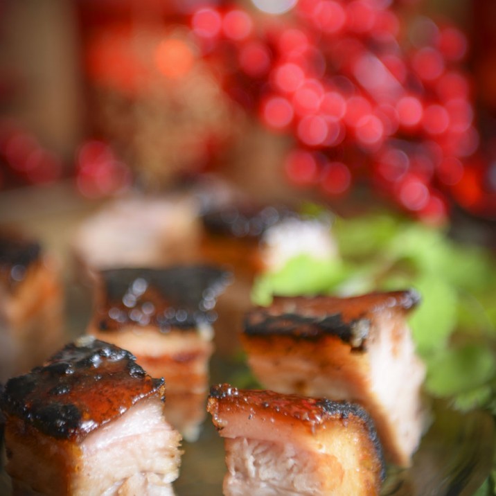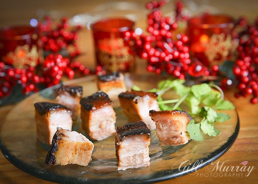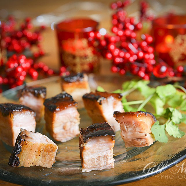 This is a great canapé to make over the festive period; your guests will snap up these delicious cubes of pork belly marinated and cooked in chinese 5-spice with soya and honey.