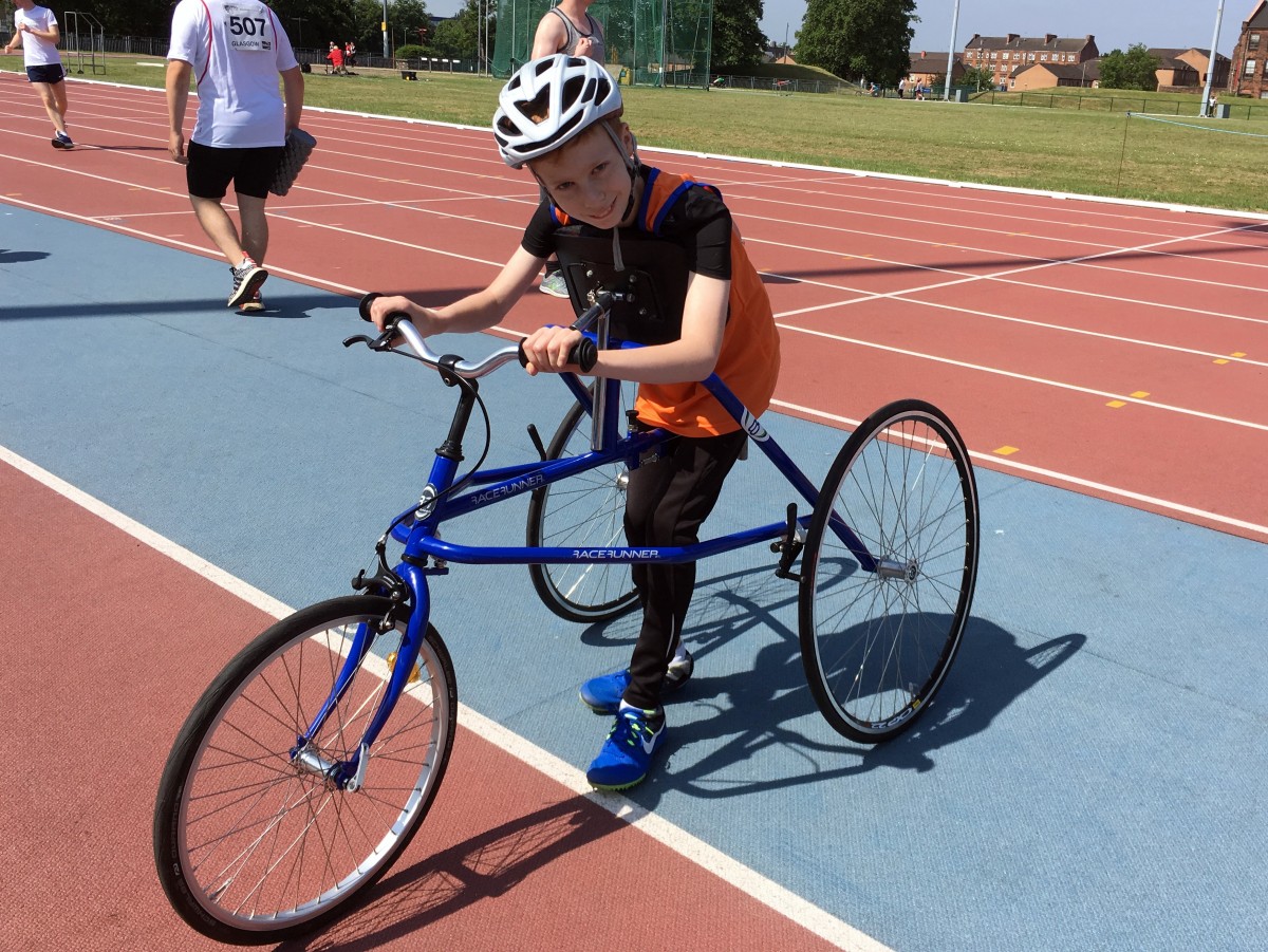 He takes part in the sport of ‘racerunning’ – an athletic discipline for disabled athletes where a running bike is used with a three-wheeled frame and a saddle for body support, but importantly it has no peddles.