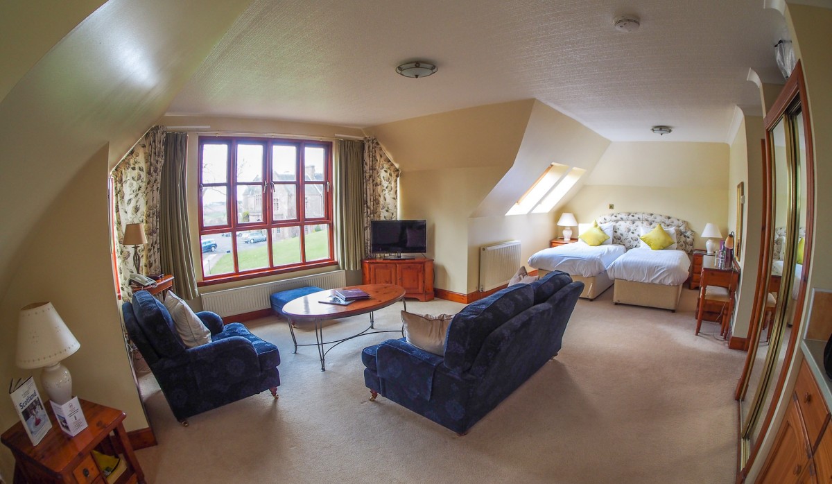 The row of suites have the appearance of cute little neighbourhood lodges, with classic streetlights to illuminate the pathway at night. Just a short stroll from the main building, we arrived at the door of our pad. We were in the upstairs suite, a delightful space with a loft-style slanted roof and front facing views of the Perthshire countryside.