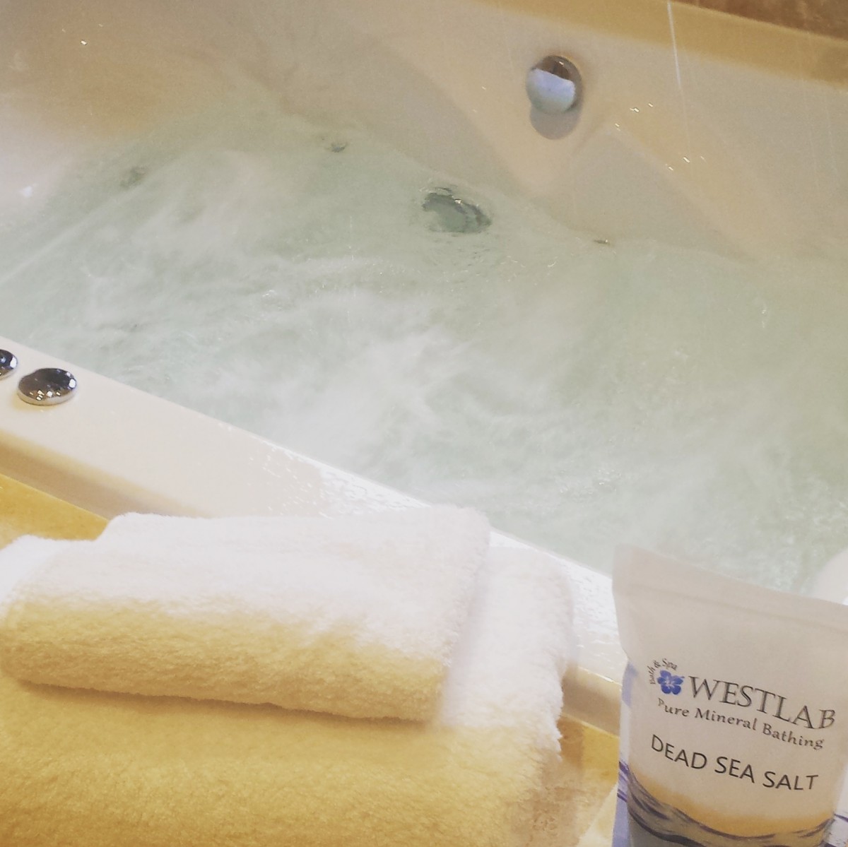 Feeling in full spa-mode now, I poured half a kilo of bath salts into the double jacuzzi-style bath in the main bathroom (which is bigger than my sitting room at home!) and chilled out while being served tea and chat by Judi and Kelly who were perched on the steps, bathrobes on, awaiting their treatments.