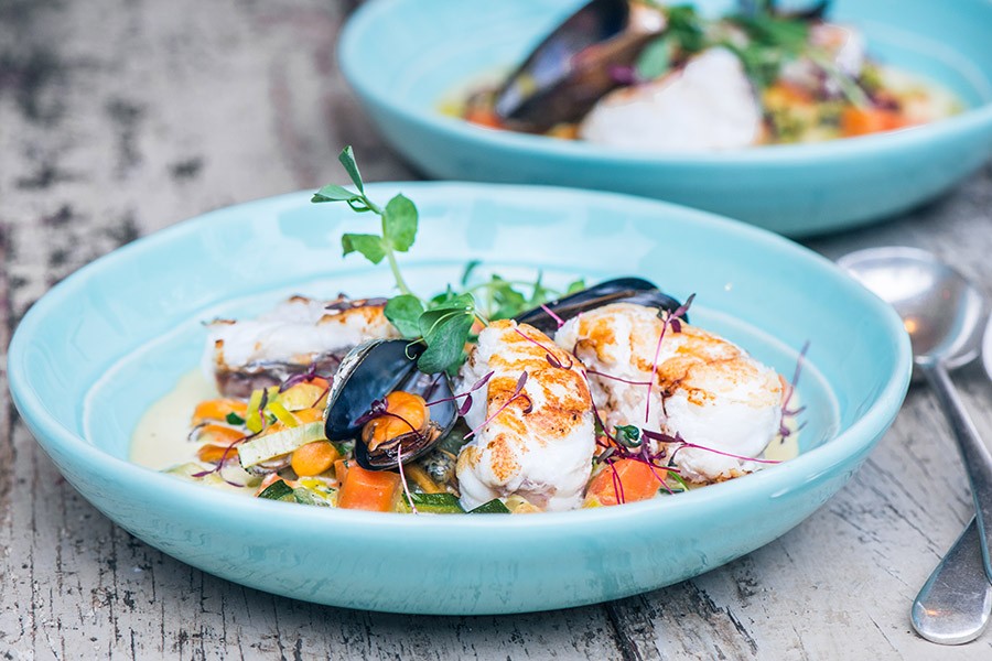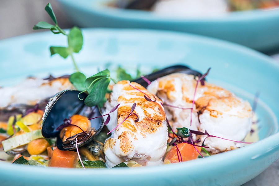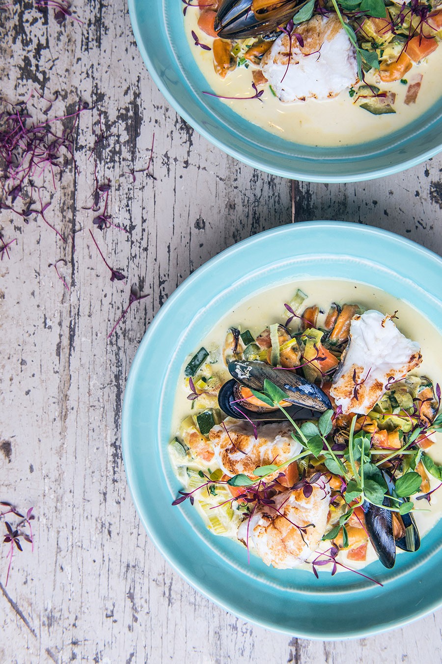 3. Put the cooking liquor back into the saucepan and reduce by half. Add the fish stock and vegetables then reduce again, season to taste and keep hot.