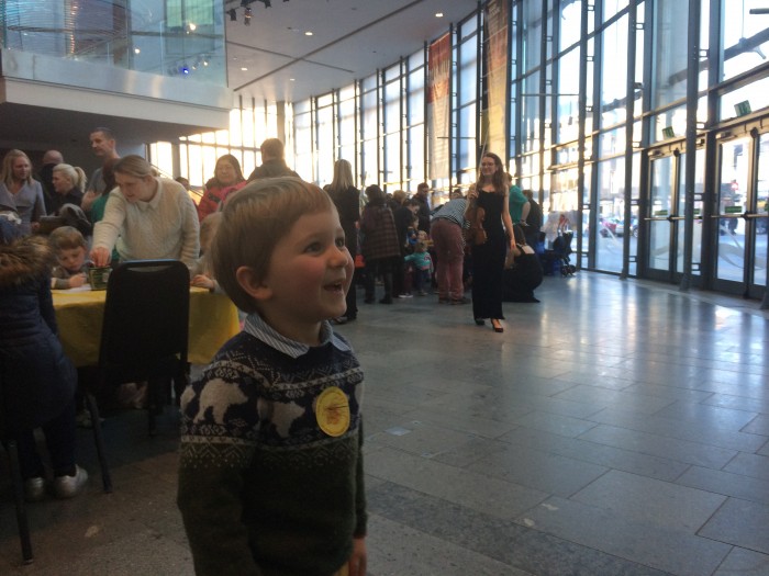 And so, a couple of weeks before the concert, we headed along to a free SCO musical workshop at Perth Theatre. It was a taster session for the music we would hear at the concert, and a great way to get the kids all fired up for what was to come. We learnt three songs from the show, complete with actions, and James was soon galloping enthusiastically around the studio on an imaginary steed. James was soon galloping enthusiastically around the studio on an imaginary steed! Members of the SCO also encouraged the children to try out various musical instruments which were fashioned in beautiful vivid colours. “Are they valuable?” I asked in trepidation, as James sawed away at a small violin, savouring the resulting screech. “Don’t worry, they’re quite sturdy!” I was reassured.