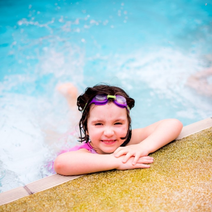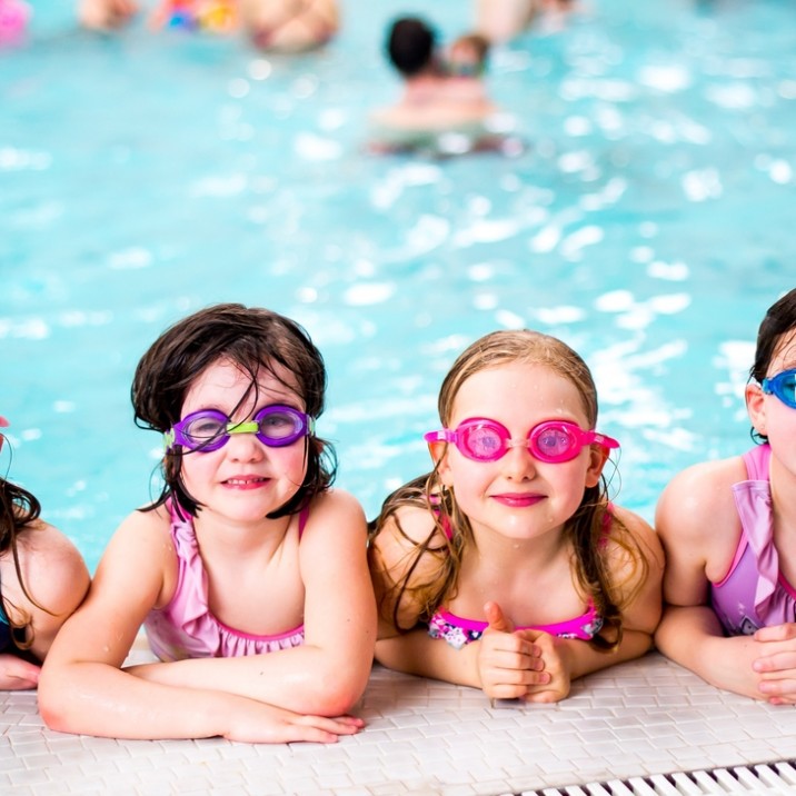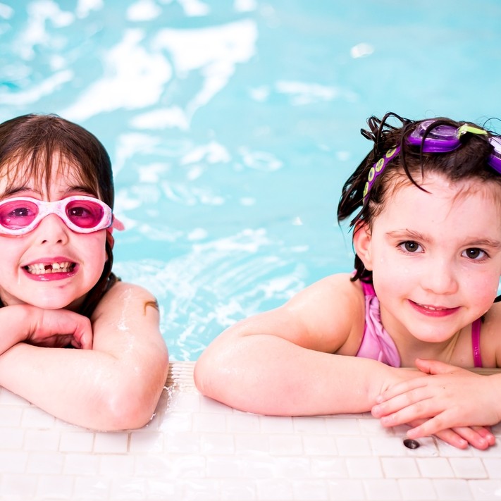 Girls with their goggles on having a break from all the fun at the edge of the pool.