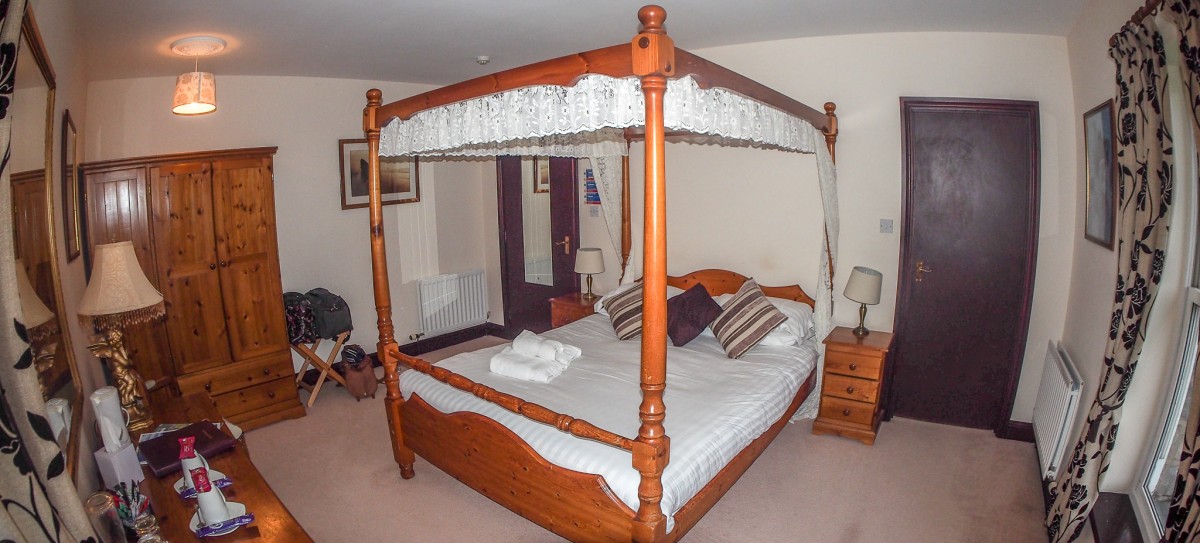 There to welcome me was a four poster bed, with fresh white linen and frilly curtains. A spontaneous comfort test was essential, and I was still lying in a starfish position some ten minutes later. We did leave the room eventually, though the extent of my exploration was a wee wander round the small lodge, before settling in front of the fire in the conservatory. It was then the downpour commenced.