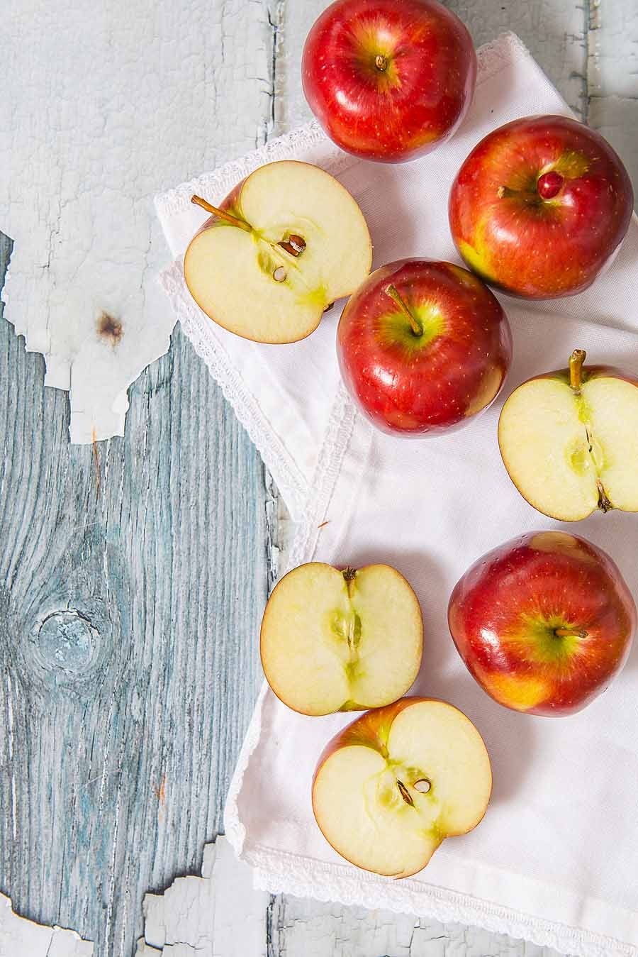 2. Peel the apples and cut in half. Using a melon baller, scoop out the cores.