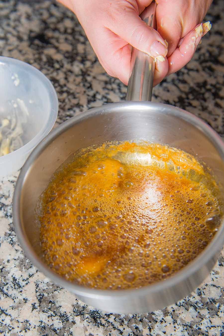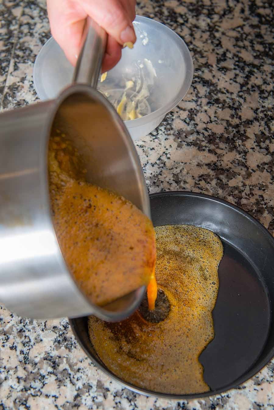 3. Pour the water in a thickbottomed saucepan (1416cm/56in) and scatter over the sugar evenly, letting the water absorb the sugar. On a medium/strong heat, cook the sugar water to a syrup then to a golden brown caramel for 56 minutes (do not stir). Immediately add the cold diced butter, swirl the pan (be careful, there will be strong boiling). Pour into a round baking tin (18.5cm x 45cm/7 x 2in) deep and let the caramel firm up.