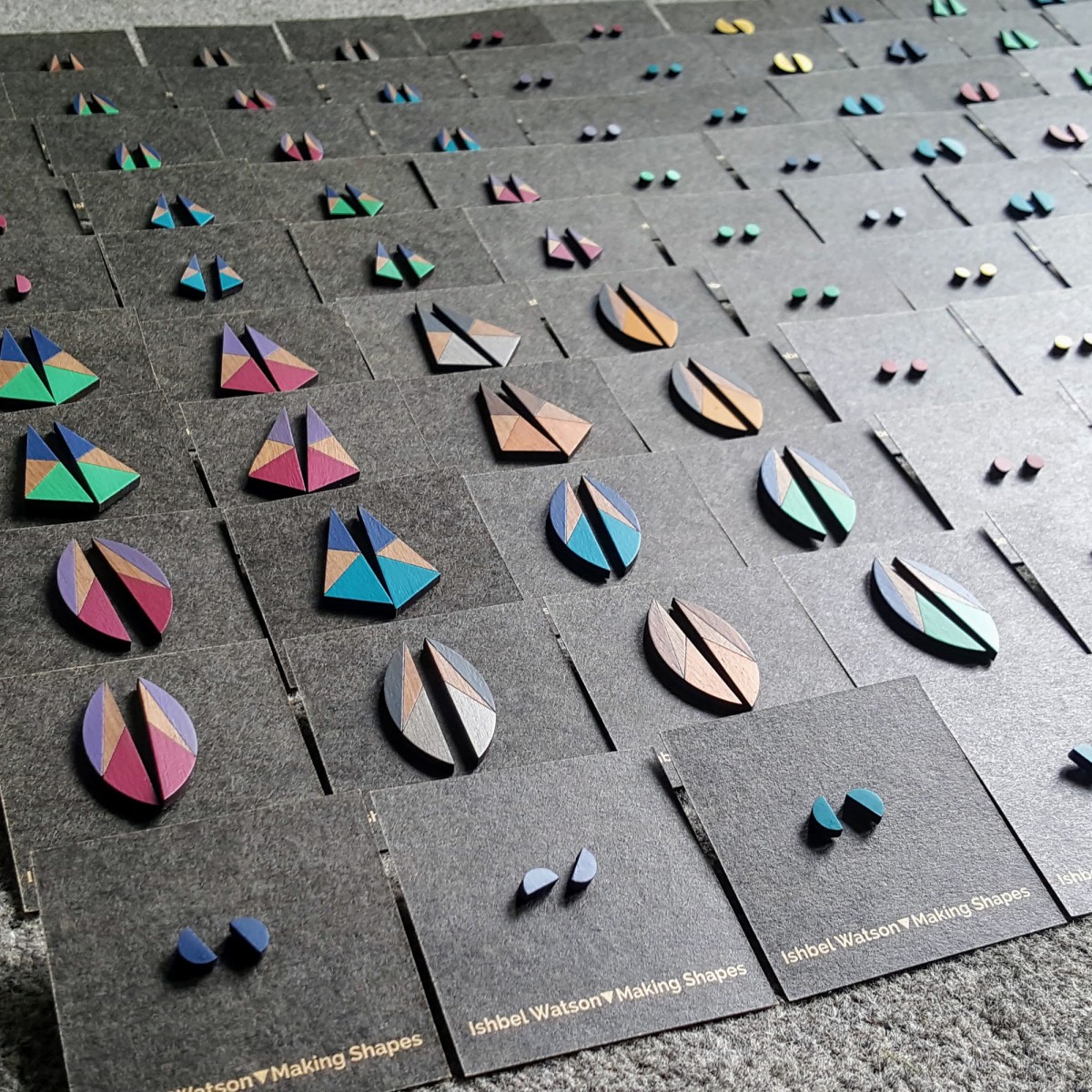 Simple statement wooden jewellery by Ishbel Watson, handmade in Glasgow. Geometric Triangle Earrings and Half Moon Earrings in a variety of different pops of colour