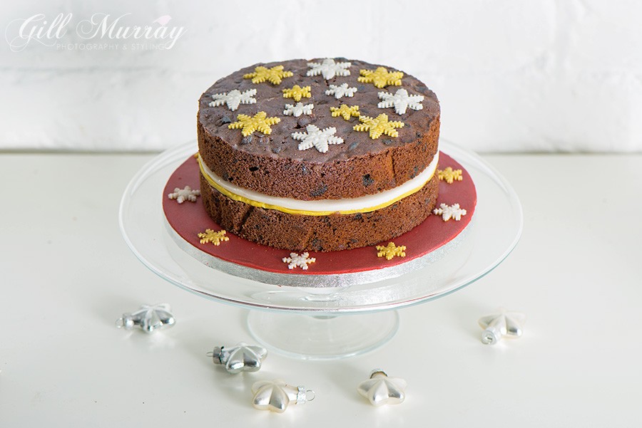 Qhen it's cool, You can choose to decorate the cake in anyway you wish. Traditional icing works well but just to show you can break from the norm and still feel festive, I've chosen to keep it simple and use snowflakes cut from soft fondant icing and marizipan and used a layer of each in the middle. Sugar glitter to coat made it sparkly and Christmas ready!