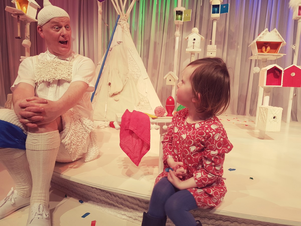 I won’t spoil it for anyone yet to go along, but safe to say the magic of colour reveals itself in the most spectacular way, which reaches it’s crescendo with the audience being doused in multi-coloured confetti (most of which Freya scooped into her boots!). I even got to (very briefly) be part of the action when asked to take a pic on Cotton’s (white, of course) camera. The characters were very happy to meet their young fans after the show – and weren’t short of selfie requests.