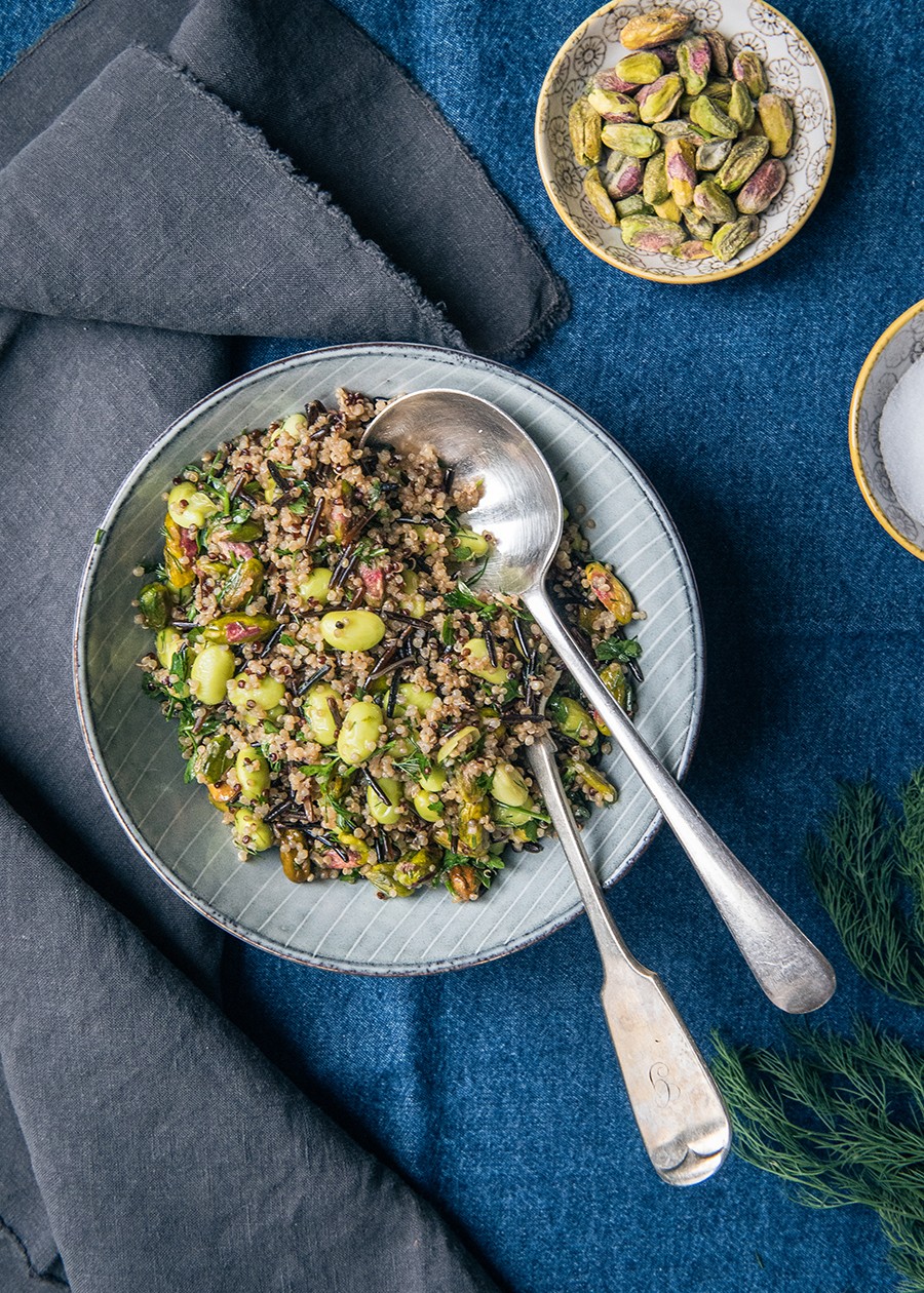 3. In a mixing bowl whisk together the olive oil, lemon juice and the zest from the lemon and lime. Add in the quinoa, wild rice, soya beans, dill, parsley and pistachio nuts and mix the flavours together. Season to taste with salt and pepper.
