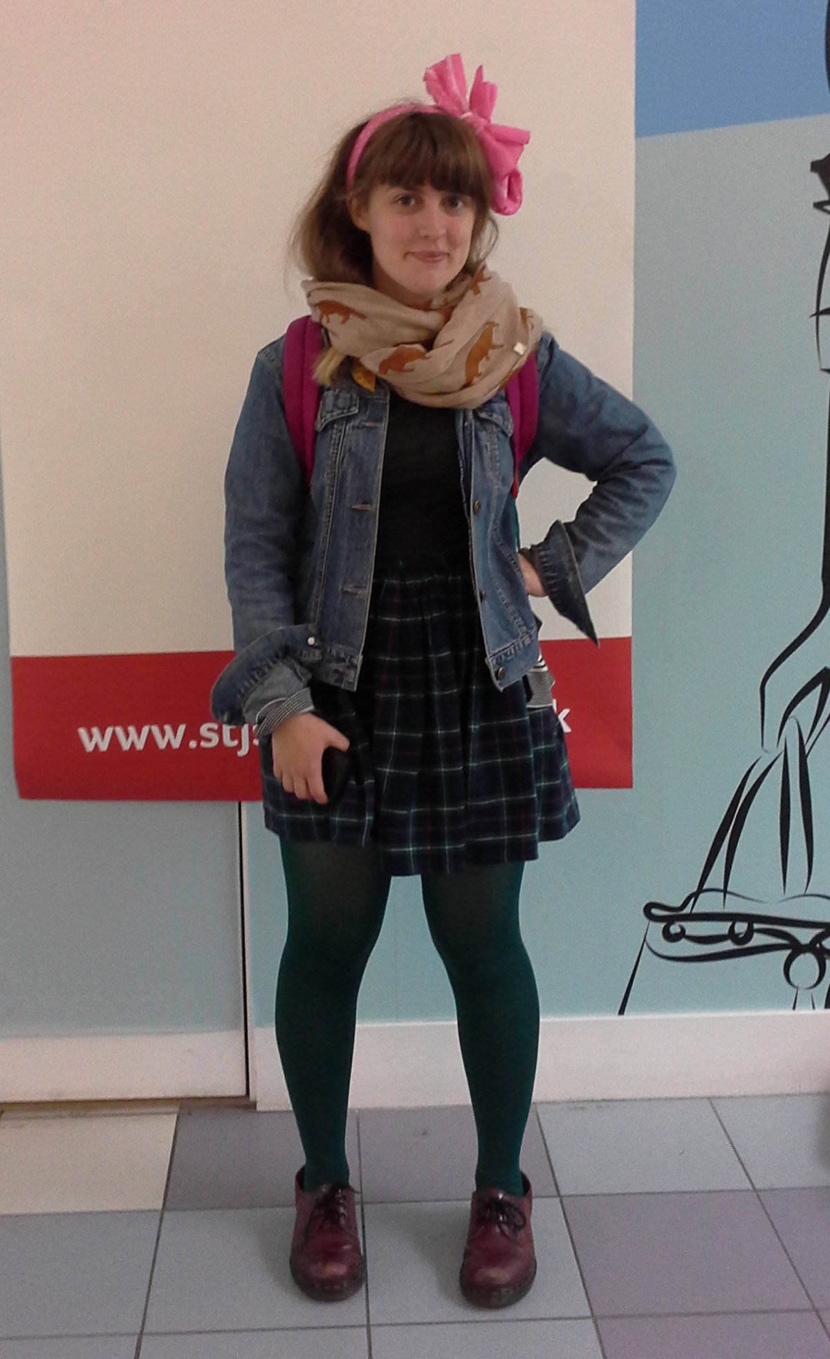 Her foxy scarf and pink bow made the student uniform of checked skirt and chunky lace-ups a look all of her own.