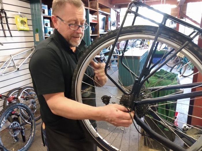 I arrived at The Bike Station and the mechanic that would be helping me out, John, showed me over to the Zero Waste Space where we hung my bike on a stand so we could work on it. John has just joined The Bike Station team this summer but he has years of experience and as he sets about trying to figure out