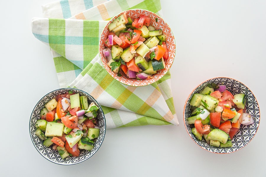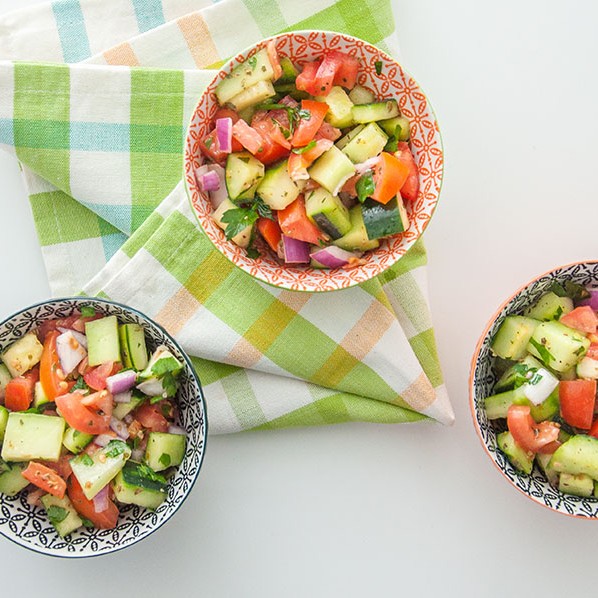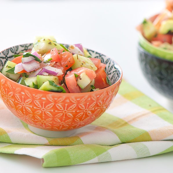 1. In a salad bowl combine the chopped tomatoes, cucumber, onion, parsley and mint.